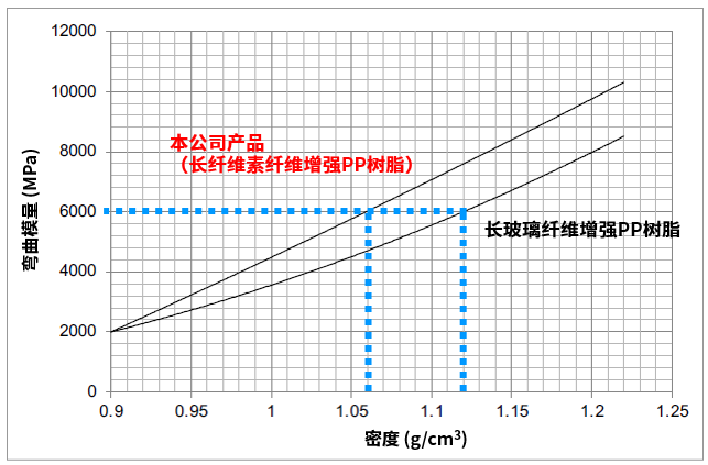 以相同的弯曲模量对长纤维素纤维增强PP树脂与长玻璃纤维增强PP树脂进行比较,可知纤维素纤维增强树脂的密度比玻璃纤维增强树脂的密度小。(图1)